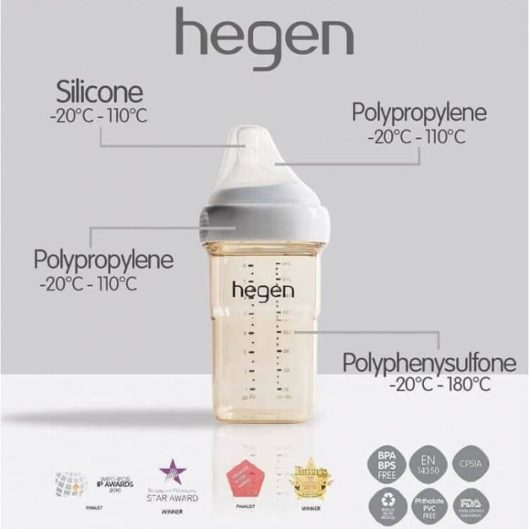 ➖ Bình sữa Hegen làm bằng chất liệu PPSU, không BPA, phủ tráng bạc tiệt trùng ứng dụng công nghệ Nano, hạn chế tối đa nguy cơ tiêu chảy ở trẻ.