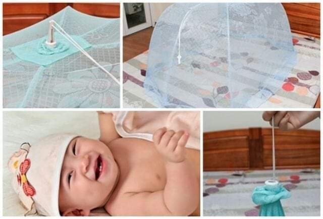 Mẹ đặt bé nằm ngủ và dùng màn để trùm cho bé. Màn cho bé có tác dụng chống muỗi, bụi trong khi bé ngủ.
