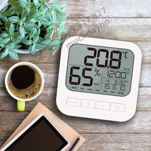 - Sáu chức năng: Đo nhiệt độ, đo độ ẩm, đồng hồ, lịch ngày tháng, hiển thị thứ trong tuần, báo thức.