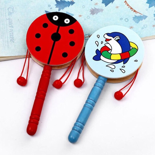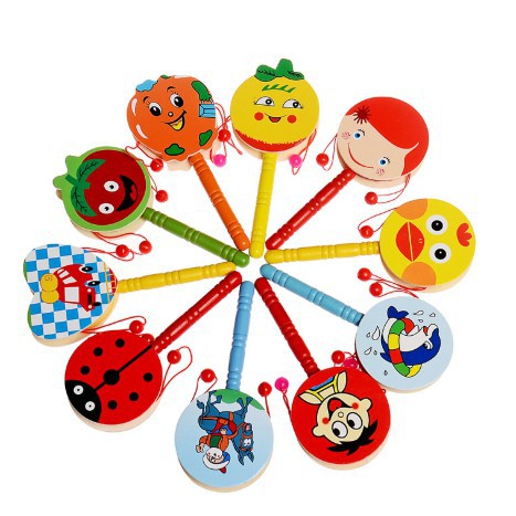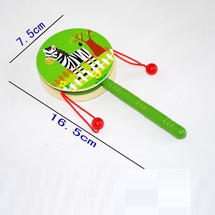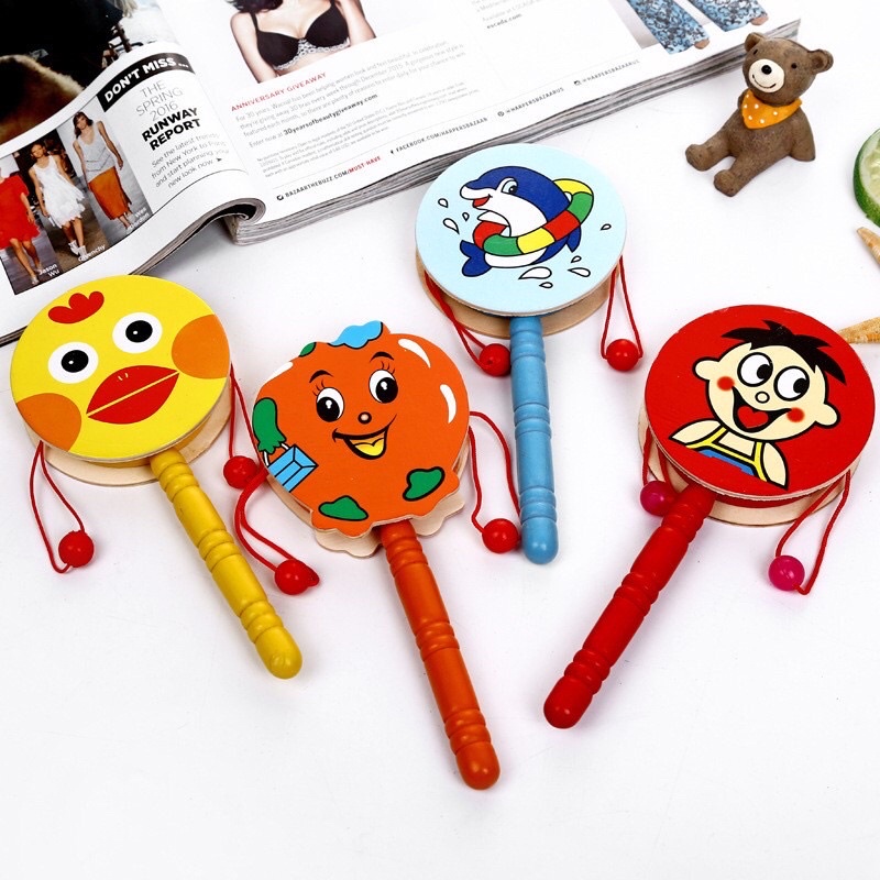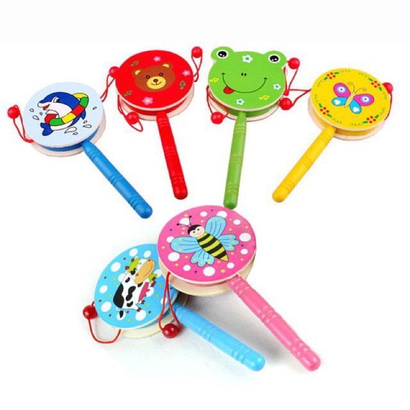 Trống lắc gỗ hình con vật phát tiếng kêu kích thích phát triển vận động và giác quan của bé (đồ chơi lục lạc)