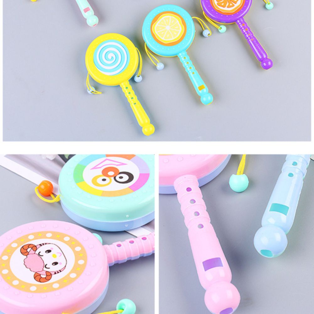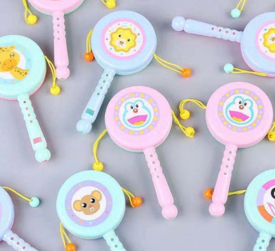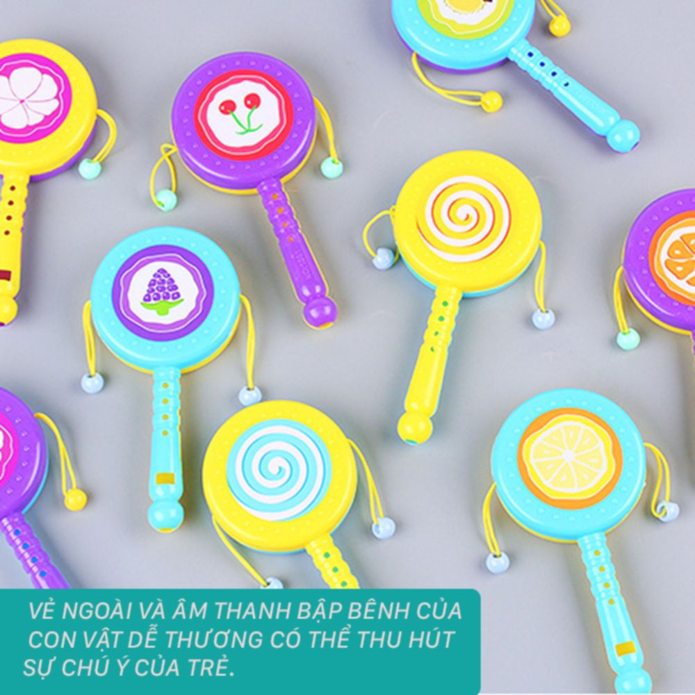 ✅ Bộ trống thiết kế xinh xắn với hình dáng, màu sắc giống một bộ trống thực thụ với một chiếc tay cầm và phần trên là trống lắc, hai bên là 2 hạt nhựa khi lắc va vào mặt trống tạo nên âm thanh.